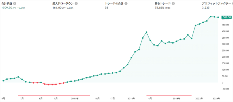 - エントリー日を含む5日間の間に、終値が買値を上回った時点で手仕舞い。
