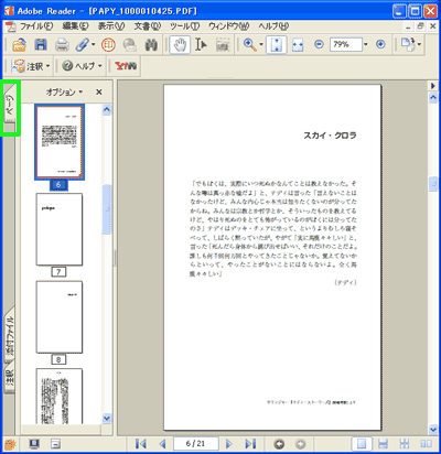 ダウンロードした圧縮ファイルを解凍し、PDFファイルをダブルクリックすると、Adobe Readerが立ち上がり書籍を読むことができます。ページを読み進めるには、キーボードもしくマウスを使います。また、次の画面例の緑で囲んだ箇所にある「ページ」タブをクリックすると、画面例のように、本の全ページが小さく表示されます。こちらをクリックして先へ進んだり、戻ったりすることができます。以上が、Adobe eBook形式の基本的な読み方です。より高度な操作については、Adobe Readerの製作元・アドビ社による操作説明をご覧ください。