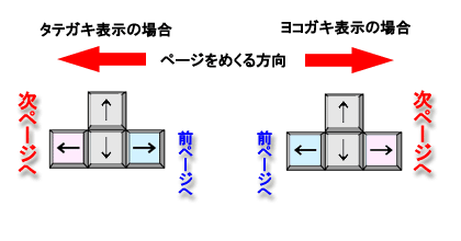 .book ファイルをダブルクリックすると、T-timeが立ち上がり書籍を読むことができます。以下、ページの読み進め方について図示します。マウスの場合左クリックでページを移動します。表示されているページの進行方向側でクリックすると次のページに進みます。逆方向側でクリックすると、前のページに戻ります。キーボードの場合左右の矢印キーでページを移動します。縦書き表示と横書き表示で、矢印の向きが逆になるのでご注意ください。実際の本と同じように、縦書きの本は左方向にめくり、横書きの本は右方向にめくる、とイメージしていただければ分かりやすいと思います。※スペースキーで「進む」、シフト+スペースで「戻る」という移動の仕方もあります。より高度な操作については、T-timeの製作元・株式会社ボイジャーによる操作説明をご覧ください。