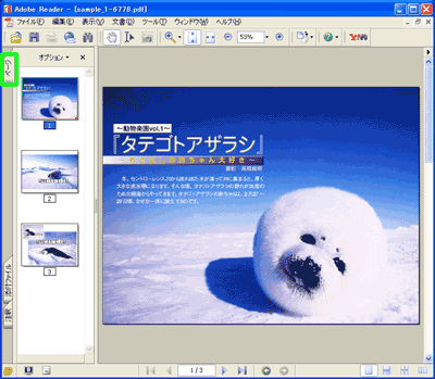 ダウンロードした圧縮ファイルを解凍し、PDFファイルをダブルクリックすると、Adobe Readerが立ち上がり書籍を読むことができます。ページを読み進めるには、キーボードもしくマウスを使います。また、次の画面例の緑で囲んだ箇所にある「ページ」タブをクリックすると、画面例のように、本の全ページが小さく表示されます。こちらをクリックして先へ進んだり、戻ったりすることができます。以上が、PDF形式(exe版)の基本的な読み方です。より高度な操作については、Adobe Readerの製作元・アドビ社による操作説明をご覧ください。
