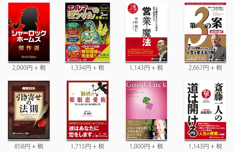 ご登録いただいたお客様には郵送にて領収書をお送りしております。お申込後に「お客様からご注文いただいた商品を本日発送させていただきました。運送会社: ヤマト運輸, 伝票番号:********」という内容の電子メールが届きますが、こちらは領収書の発送についてのご連絡となっております。 ご利用例でじじでは、誰もが知る名作から話題の新刊、海外古典の新訳版まで、さまざまな本がオーディオブックになっています。当然、価格もそれぞれですが、マンスリープランならどの2冊を選んでも月額1,500円(税別)だけでダウンロードして聴くことができます!