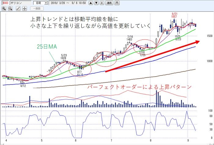 移動平均線(MA)が上向きで、期間が短期から長期まで順番に揃っていることをパーフェクトオーダーといいます。この形が整えば、しっかりとした上昇トレンドに発展します。しかし上昇トレンドには、必ず小さな上下の波動があり、この波動の動きを理解していないと、いくらエントリーする前に、大きな利益を狙うと決めていても、目先の損益に翻弄されて、すぐに手放してしまいます。